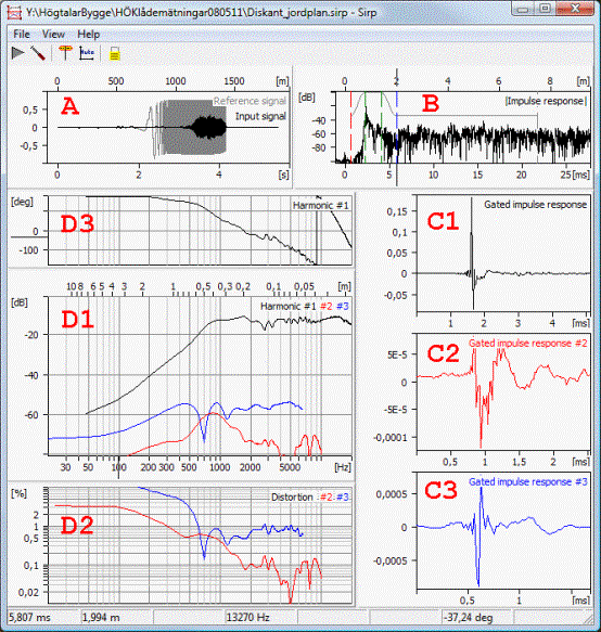 A Sirp measurement of a tweeter on a baffle. The pseudo-anechoic response of the tweeter and distortion is shown in panels D.